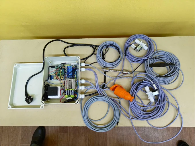На фотографиях ниже представлены основой блок (в открытом и закрытом виде), датчики влажности и температуры воздуха и земли, электромагнитные клапаны, двойной поплавковый датчик-выключатель, розетка с напряжением 220 В